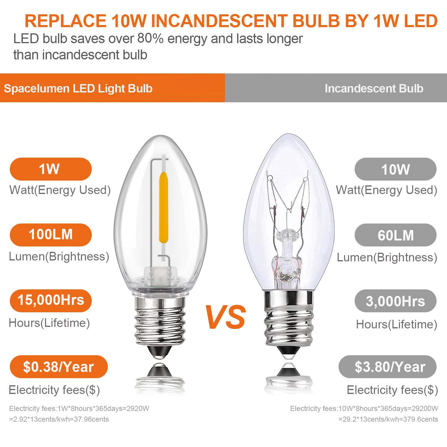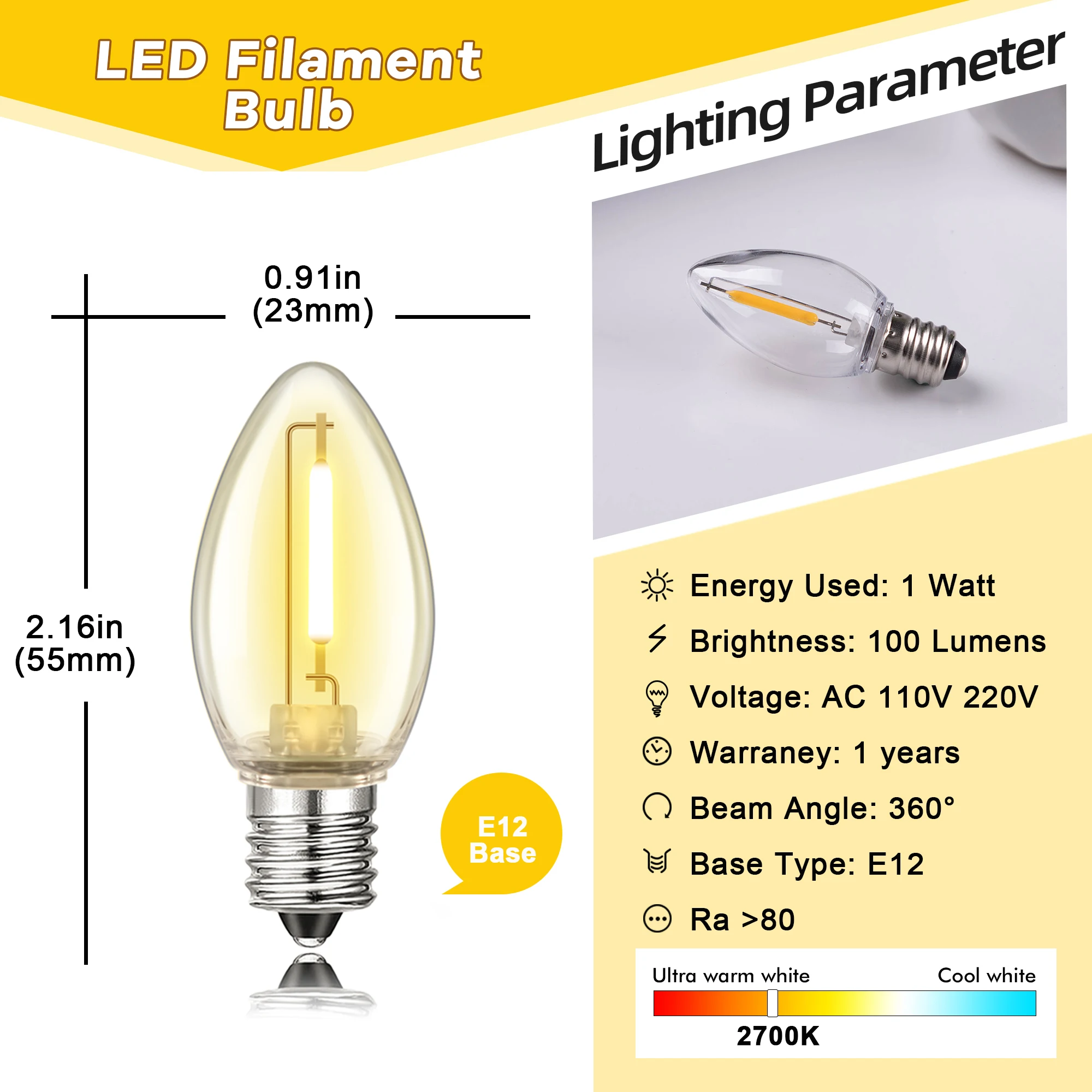 【Wide Compatibility】: Designed with a standard E12/C7 candelabra base, our clear LED night light bulb is compatible with a variety of E12 base light fixtures and C7 string lights. Use LED C7 bulbs to replace your old incandescent bulbs, creating a stunning visual impact for your indoor or outdoor decorations.
